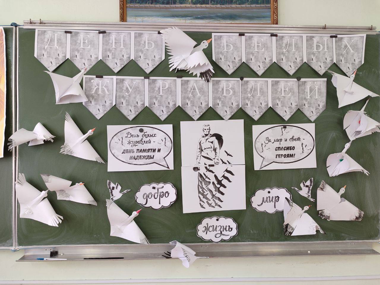 Под звучание песни «Журавли» в исполнении Марка Бернеса, ребята совершили виртуальное путешествие по странам и городам, где установлены памятники «Белым журавлям», как призыв к миру, милосердию и добрососедству. Почтили минутой молчания всех, кто, не жалея себя, боролся за свободу нашей Родины, стоял до последнего на фронтовых рубежах и защищал тылы, в годы Великой Отечественной войны, в Афганистане, в Чечне, кто встал на защиту России и отдал жизнь в специальной военной операции.