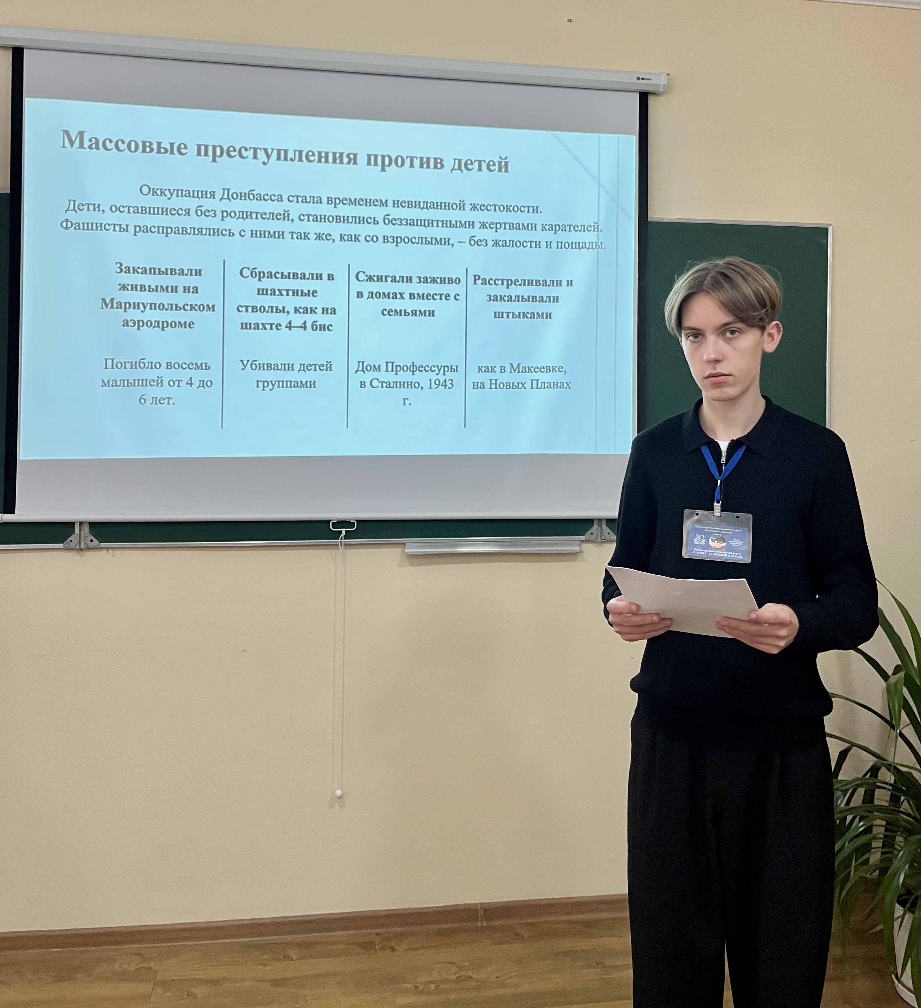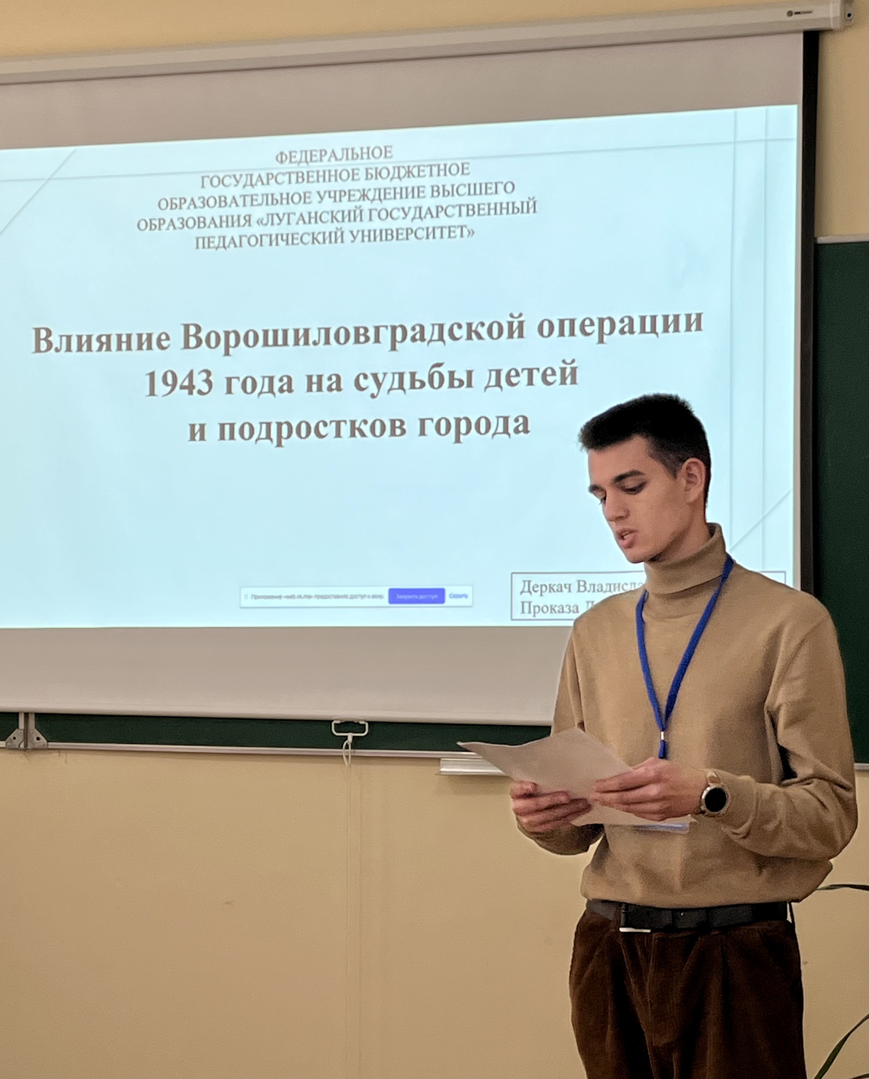 Первокурсники ЛГПУ Владислав Деркач (направление «Профессиональное обучение (по отраслям)», профиль «Транспорт») и Дмитрий Проказа («Документоведение и архивоведение») представили проект «Влияние Ворошиловградской операции 1943 года на судьбы детей и подростков города».