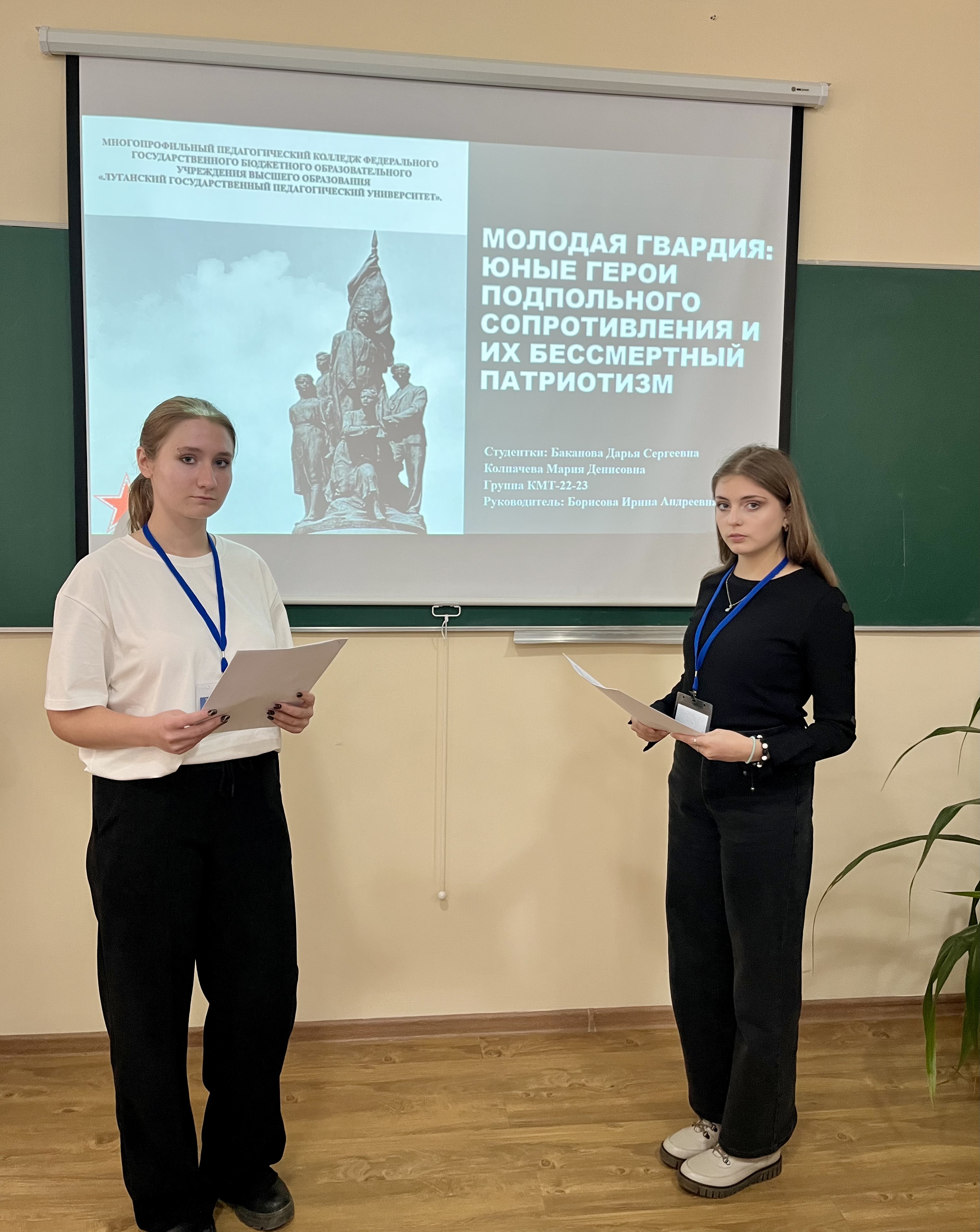Дарья Баканова и Мария Колпачева, студентки третьего курса специальности «Конструирование, моделирование и технология изготовления изделий легкой промышленности» (Многопрофильный педагогический колледж ЛГПУ), рассказали об исследовании «Молодая гвардия Ворошиловграда: юные герои подпольного сопротивления и их беспримерный патриотизм».