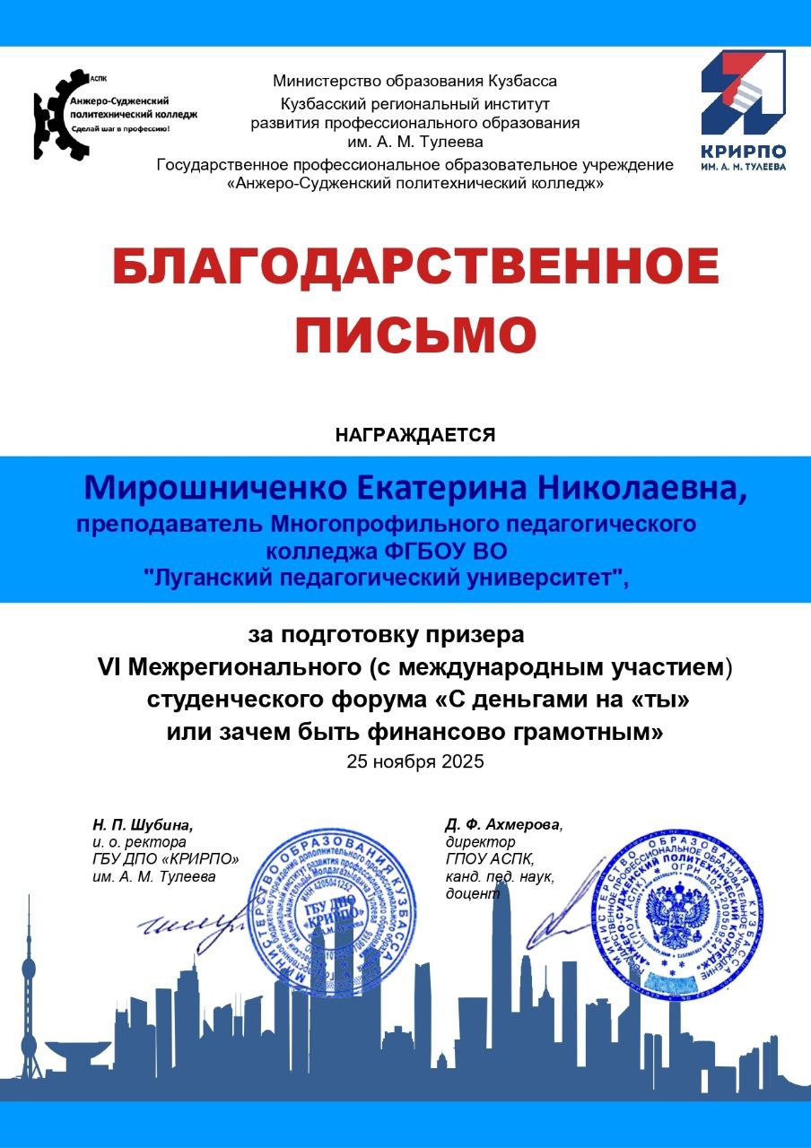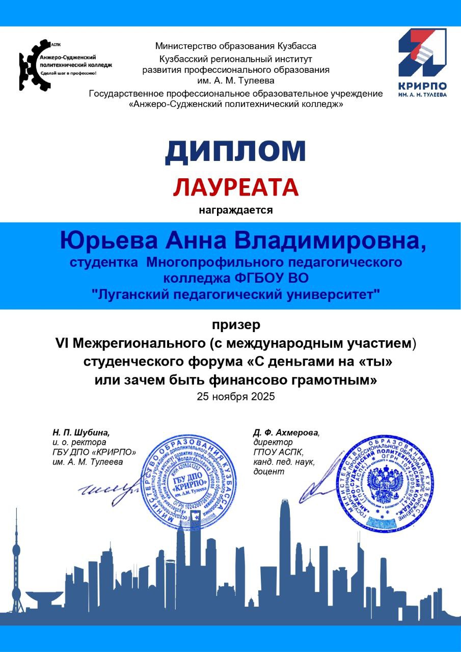 Студентка специальности «Дошкольное образование» Многопрофильного педагогического колледжа ЛГПУ Анна Юрьева стала призером VI Межрегионального студенческого форума (с международным участием) «С деньгами на «ты» или зачем быть финансово грамотным»! Форум состоялся 25 ноября 2025 года на базе Кузбасского регионального института развития профессионального образования имени А.М. Тулеева.